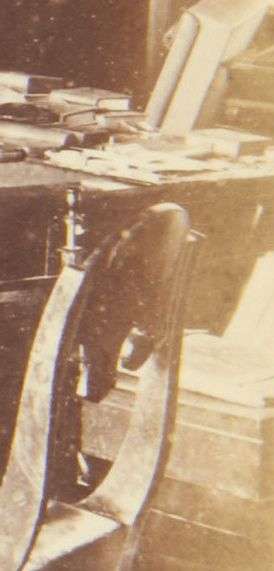 | Фото с Александром 2 Спинка стула заметно возвышается над столом и закрывает   бумаги на столе. В просвете спинки – те же предметы, в том же ракурсе, что на   соседнем (оригинальном) фото. Данное же фото – безусловно подделка. К слову, стул вырезали не очень аккуратно, осталась черная   кайма слева по краям – след затемненной части. Но стул (как минимум, верхняя   часть спинки) безусловно тот же самый, просто обезображенный древним   фотошопом. | Фото пустого кабинета Короткая спинка стула. С теми же предметами и в том же   ракурсе, видимыми в просвете спинки. Это значит, на предыдущей фотографии   стул: 1) вырезали из фотографии № семь, 2) искусственно увеличили, то есть   вытянули вверх и 3) вклеили в коллаж – вместе с сидящим на нем царем.   Характерно, что у одной из бумаг ("раскрытой книге"),   "засветившейся" в просвете спинки, на этом фото есть продолжение, а   на предыдущем (фото с Александром Вторым) книгу вырезали и поместили ниже – ниже той части этой же книги,   которая вошла в коллаж и видна в просвете спинки стула. Посмотрите сами и   убедитесь. |