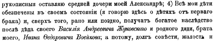 В бумагах сказано: после смерти Жуковского детям Воейкова от первого брака причитается часть имущества Жуковского, потому что они его внуки. Поэтому Воейков спокоен за их судьбу.